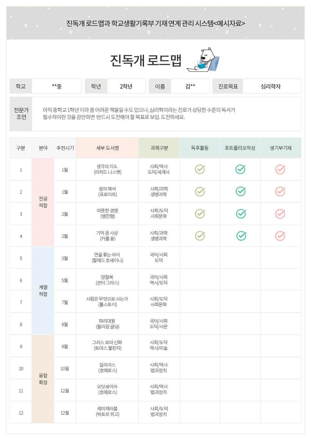 진독개 로드맵은 기본적으로 전공적합, 계열적합, 융합확장 등 세가지 측면서 수준별 도서를 추천합니다. 즉, 진로와 입시 측면에서 맞춤형 솔루션을 제공합니다.